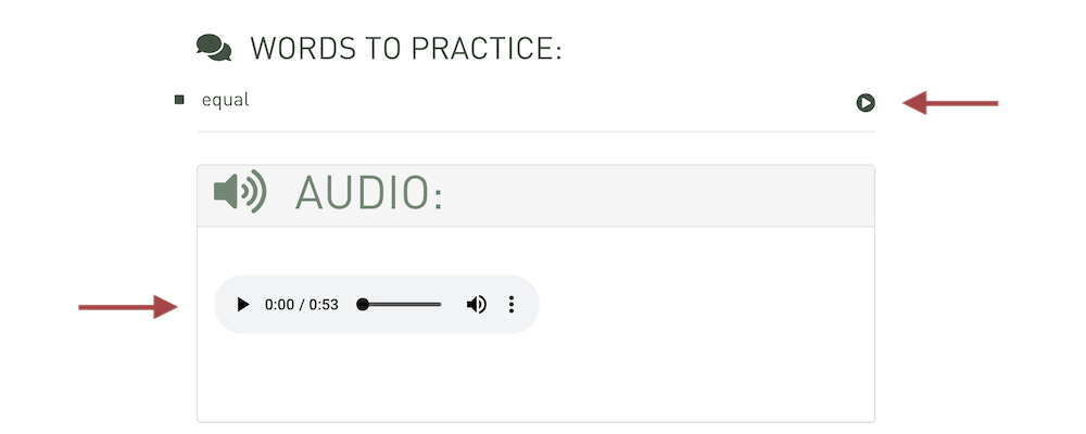 - ボキャブラリー、フレーズ、発音練習、ホームワークなどの横にある音声(下記画像:再生ボタン)