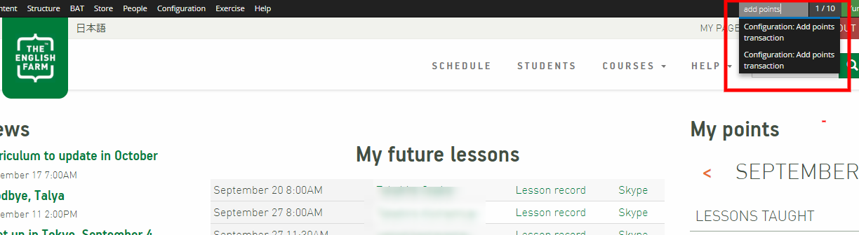 - Go to the top right-hand corner and type "add points". Click on "Configuration: add points transaction".