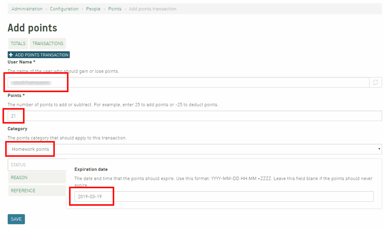 - You will jump to this page. Type in the student's user name, number of points you're giving them, and homework points (when you click "Category", you'll see it on the list). You don't put in the expiration date because they don't expire. You also need to type in a reason (this will be shown in the next step).