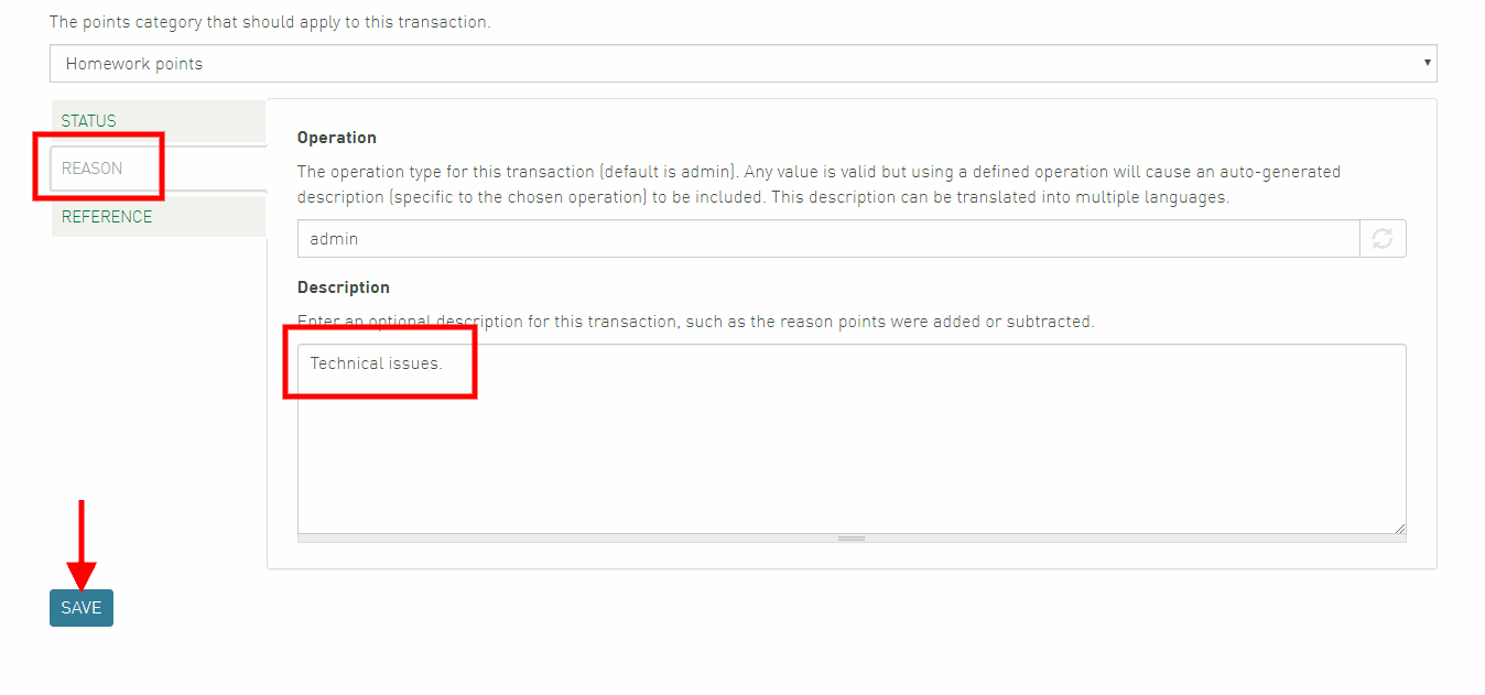 - Next, click "REASON" and write a reason. Remember that the reason will be sent to and seen by the student, so please keep that in mind when you are writing the reason. Once you're done, click "SAVE".