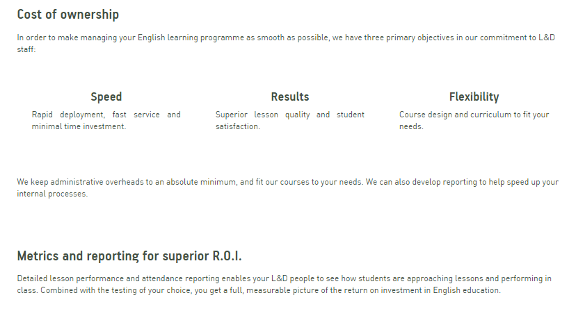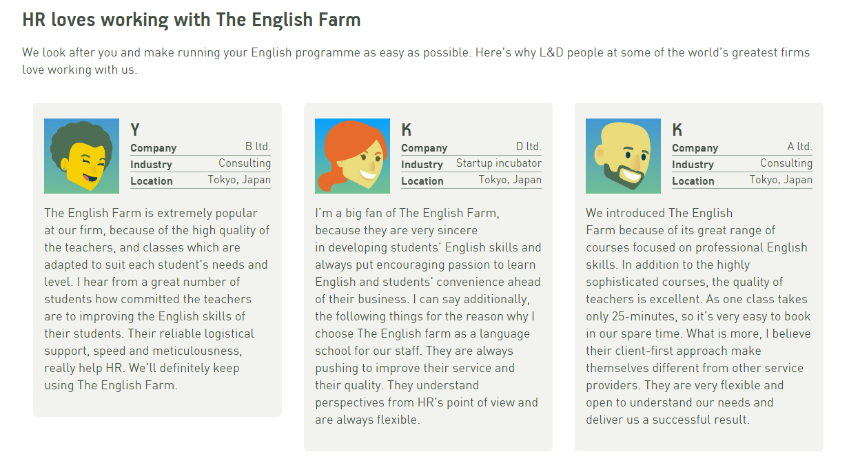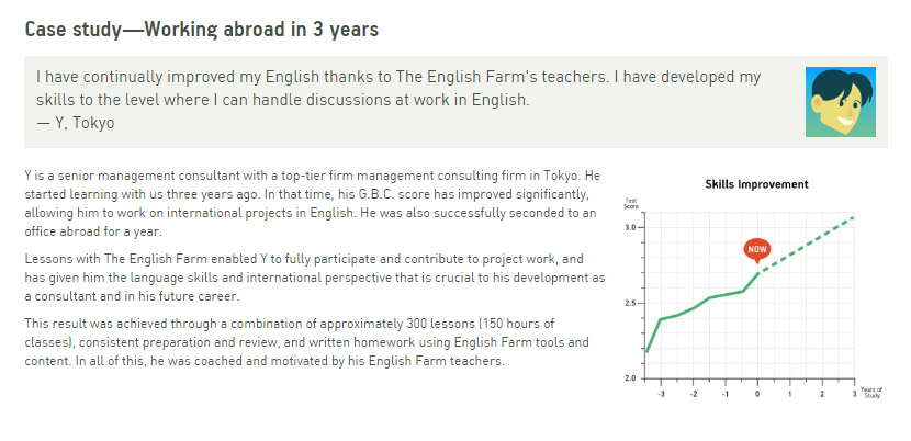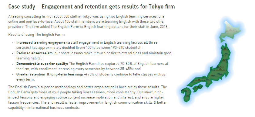 The second case study shows an increased level of engagement and retention from students at a consulting firm in Tokyo (BCG, but don't tell clients) after adding The English Farm's services. Both engagement and retention are crucial to improving language skills because frequency and consistency are what help people improve. Taking one lesson a week is only good for maintaining your level. You need to take frequent lessons at short intervals to actually improve.