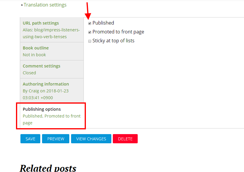 Step 4: Scroll down, and go to "URL path settings". Unclick the "Generate automatic URL alias" box, and paste the link you just copied into the "URL alias" box. As you can see, it says "blog/impress-listeners-using-two-verb-tenses" in the box.